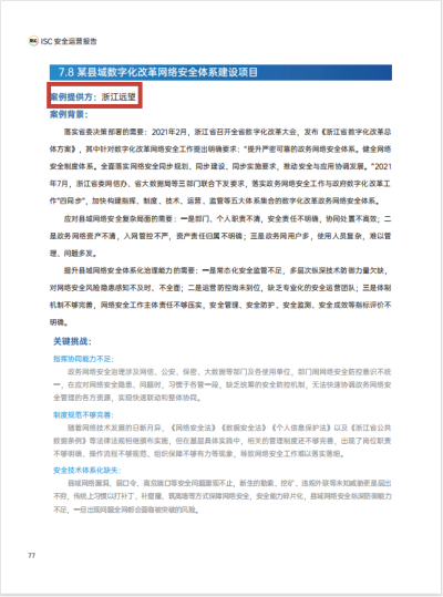 近日,《ISC 2023安全運營(yíng)市場(chǎng)洞察》報告(以下簡(jiǎn)稱(chēng)《報告》)正式發(fā)布,遠望信息某縣域數字化改革網(wǎng)絡(luò )安全體系建設項目入選《報告》典型落地實(shí)踐案例。